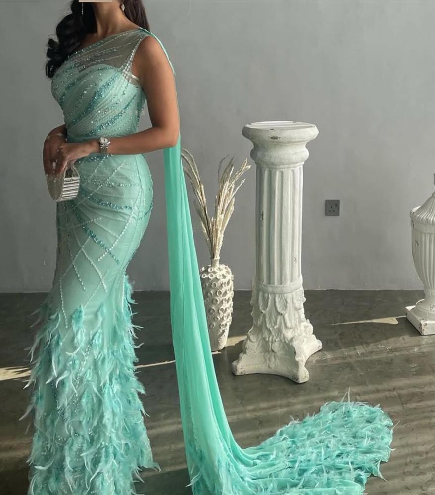 فستان سهرة مزين بتطريز دقيق مع شال شفاف يضفي لمسة من الأناقة والفخامة.
